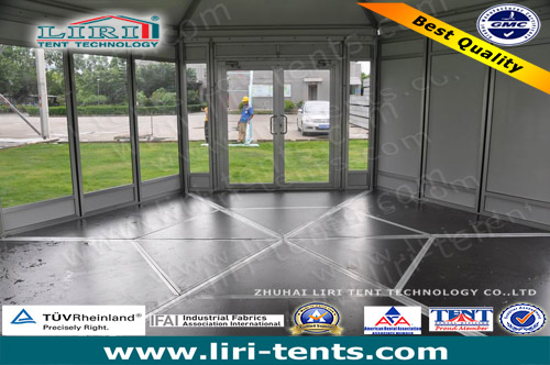 1. Frame adopts hard pressed extruded aluminium 6061/T6. Roof cover and sidewalls adopt double-PVC coated polyester textile which is waterproof, fire retardant and UV resistant.
