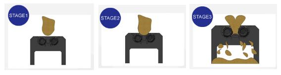 The material through the feeding system into the shredding chamber ,The material is taken up by the craw of cutting rotor and shredded repeatedly against the stator blade, using the tried-and-tested rotor/stator principle. This continues until the desired size has been achieved and the material can pass through the perforated screen underneath.