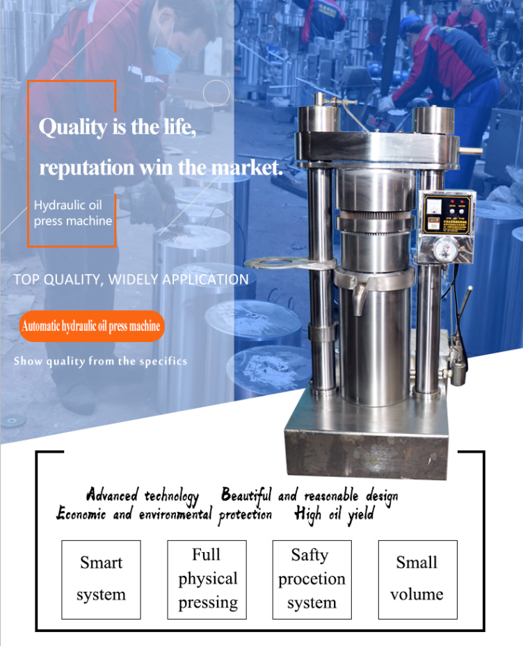 Innovative concept, electromechanical integration The design is scientific, the structure is reasonable, the operation is simple, the safety is stable, and the fully automated device is used. It takes only a few minutes from the feeding to the finished product. Excellent material, precision It is made of high carbon steel, high frequency quenching and heat treatment. It has high hardness, high strength and good wear resistance. It is suitable for high temperature and high pressure continuous operation and improves the service life of oil press. The use time can reach several decades long.