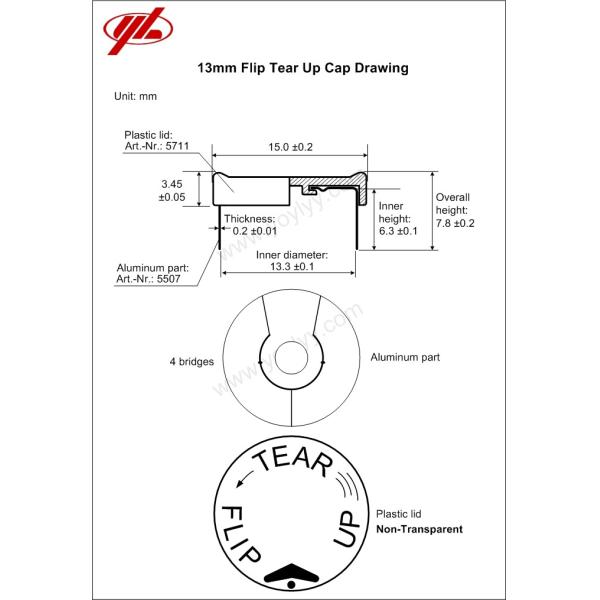 1, This is 13mm tear off cap,there are two kinds of cap,one is a transparent double-arrowhead,