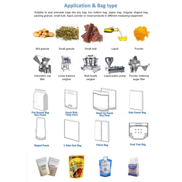 It is mainly apply in food, metal and plastic industries for auto weighing and packing by pre-made pouch, suitable for all solid granular products weighing and packing, such as Rice, Pulses, Tea, Coffee beans, Candies / Toffees, Tablets, Cashews nut, peanut, Potato / Banana wafers, Snack foods, Fresh & frozen foods, Dried fruits, Pasta pieces, Detergents, Hardware items, Spices, Soup mixes, Sugar, nail, plastic ball, cookie, biscuit ,etc.