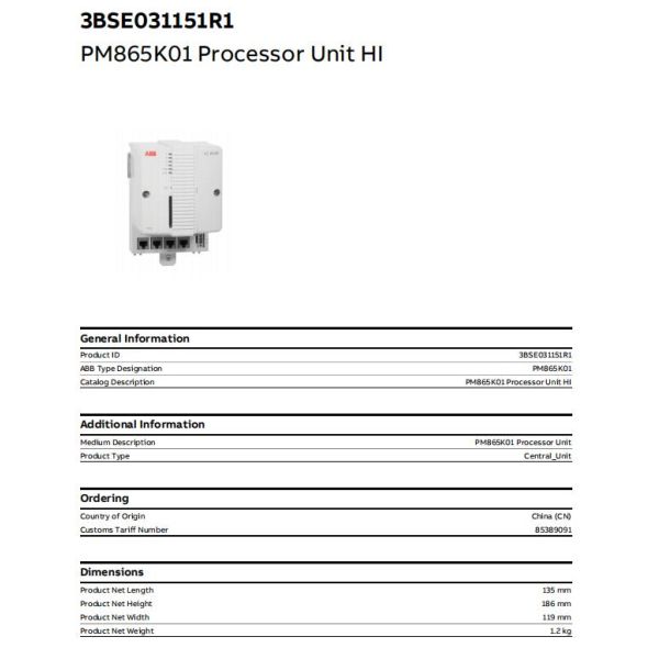 PM865K01 3BSE031151R1 ABB Processor Unit