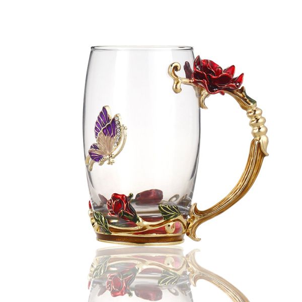 350ML Enamel Tea Cup Glass Coffee Mug Handmade Rose Flower Tea Mug
