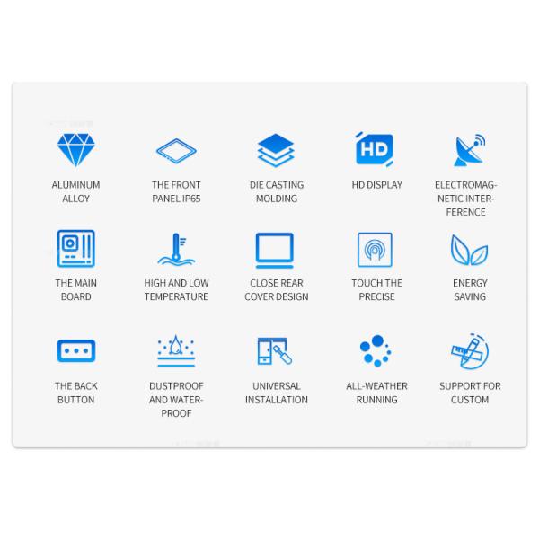 Power supply: External power supply 12V Special structure: Fanless dustproof structure Aluminum alloy cooling back cover Can be installed and built-in: Wireless wifi, 4G, Bluetooth(optional) Viewable size: 304mm x 228mm Shell size: 378mm x 297mm | Bracket hole: 75mm x 75mm Appearance material: Metal cold rolled sheet Bracket: Wall Hanger / Die-casting desktop bracket (optional) |