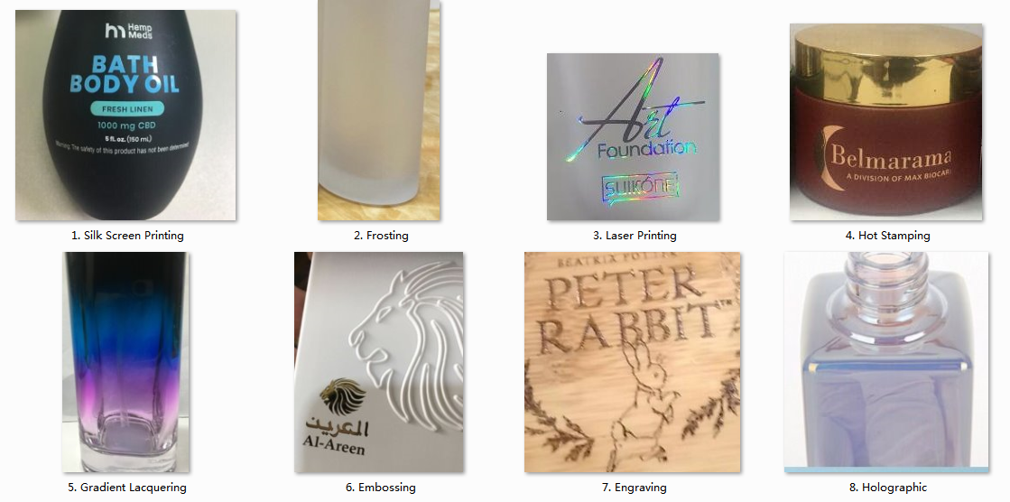 Silk screen printing, Foil hot stamping, different color lacquering, holographic printing, Logo emgraving on bamboo or wood, Logo embossing on aluminum cap, etc..