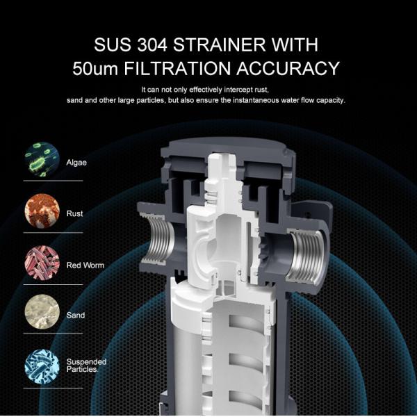 100% SAFE MATERIAL - 50 Micron food grade stainless steel mesh filter to reduce and capture particles larger the 50μm (half the thickness of a human hair!) from entering your home. Valve head made of high quality brass. The transparent screen filter bowl can withstand a burst pressure of more than 725 psi (5Mpa), has excellent anti-freezing and water hammer resistant capabilities.