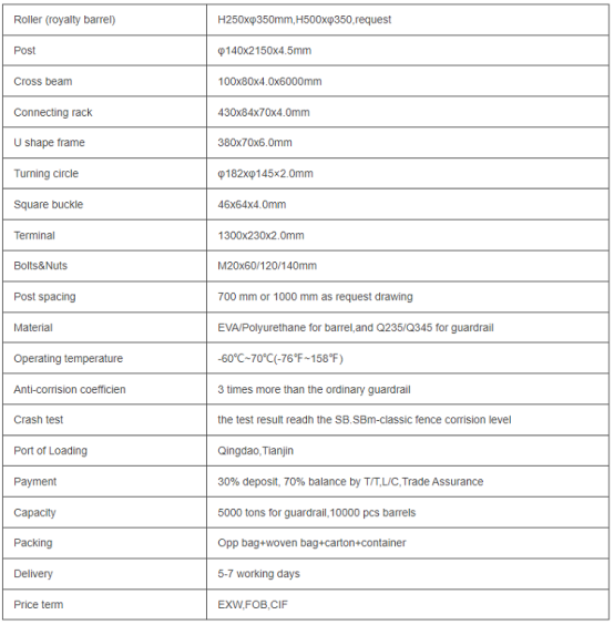 The roller of the rolling guardrail is made of EVA and polyethylene mixture, and its color can be chosen according to customers’ requirement as yellow, orange, etc.. The roller is made from one modle, no obvious skew. When the rolling guardrail is hit by the vehicle, the roller can rotate under the impact force, driving trajectory of runaway vehicle from the vertical direction parallel to transform guardrail direction, in order to resolve the impact force and reduce the severity of collision accident. Due to the excellent elasticity and restoring force of the roller, the rolling guardrail can not only avoid to be damaged during the collision process, but also effectively protect the runaway vehicles and passengers.