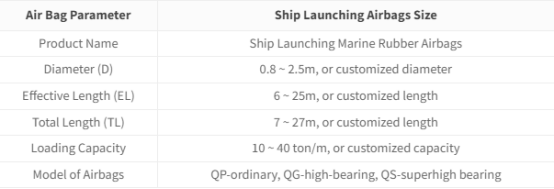 You can choose the required diameter and effective length to meet your projects. Refer to how to select marine rubber airbags to know more. The below specification only is our standard specification arrange. Other specifications Ship Launching Airbags also can be supplied upon clients’ request. For other information, you also can refer Airbag Launching.
