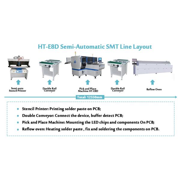 The production line of HT-E8D-1200 is semi-automatic production line, including semi-automatic stencil printer, conveyor, pick and place machine, reflow oven.