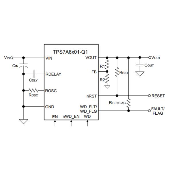 TPS7A6333QDRKRQ1 is a low-dropout linear voltage regulators designed for low power consumption and quiescent current less than 35 µA in light-load applications. These devices,designed to achieve stable operation even with a lowESR ceramic output capacitor, feature an integrated programmable window watchdog and overcurrent protection. Designers can program the output voltage using external resistors. A low-voltage tracking feature allows for a smaller input capacitor and can possibly eliminate the need of using a boost converter during cold-crank conditions. The poweron-reset delay is fixed (250 µs typical), or an external capacitor can program the delay. Because of such features, the devices are well-suited in power supplies for various automotive applications.