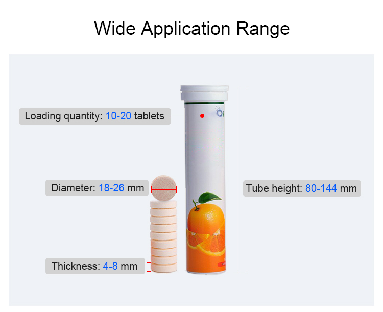 The effervescent tablet tube filling machine is composed of a pair of punching dies. The punch moves up and down to tube filling the granular material into a piece of machinery. Tablets with text, trademarks and patterns. The weight, thickness and hardness of the tablet can be adjusted, and different products can be tube filling ed by changing different molds.