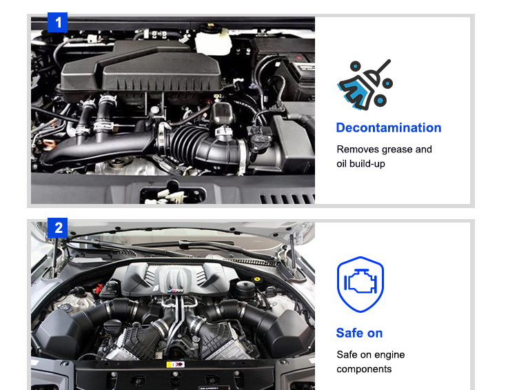 1) Rapidly remove the dirt, oil stain and other deposit from the engine surface without damage to the rubber,