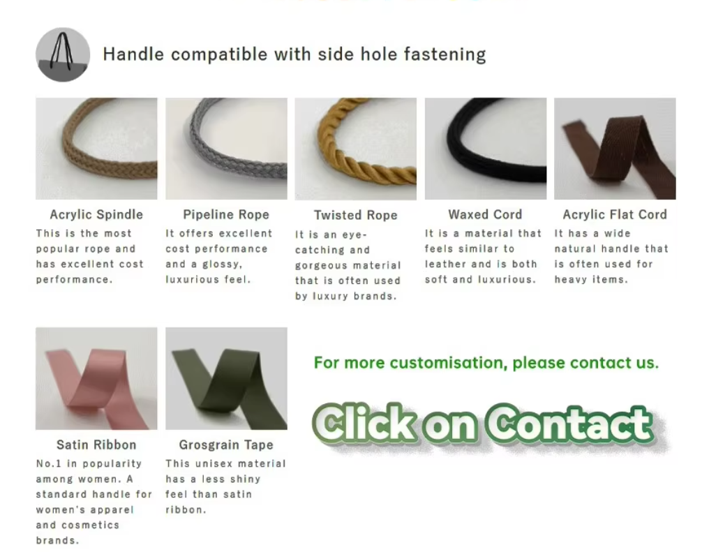 Choose from a selection of paper bag materials including white kraft paper, brown kraft paper, art paper, eco-friendly paper, recycled paper, laminated paper, and corrugated paper to suit your specific needs. Customize your paper bags with your own logo and designs for a personalized touch.
