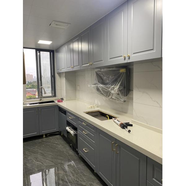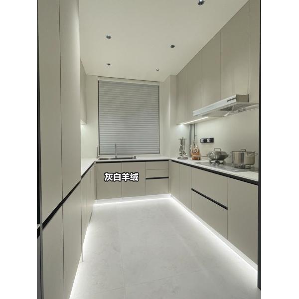 For the countertops, the Modern Kitchen Cabinet features options such as quartz stone and sintered stone, both of which are durable and low-maintenance materials. Quartz stone is known for its scratch and stain resistance, while sintered stone offers high heat resistance, making them ideal choices for busy kitchen environments.