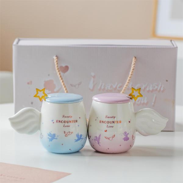 Celebrate love with this adorable 2-piece mug set, designed for couples or thoughtful gifting. Each mug—one in soft pink, the other in light blue—boasts matching winged handles, pastel fairy and star illustrations, and the romantic text "Sweetly ENCOUNTER Love." Presented in a white gift box with heart-patterned lining and rope handles, it’s more than mugs; it’s a promise of shared warmth. Imagine sipping matching drinks with your sweetheart—every detail radiates sweetness.