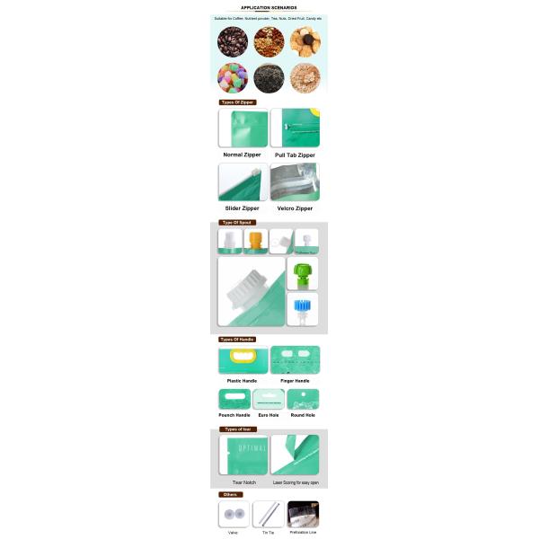 | Food Packaging Style: | Stand Up Pouch, Flat bottom pouch, side gusset bag, spout pouch |