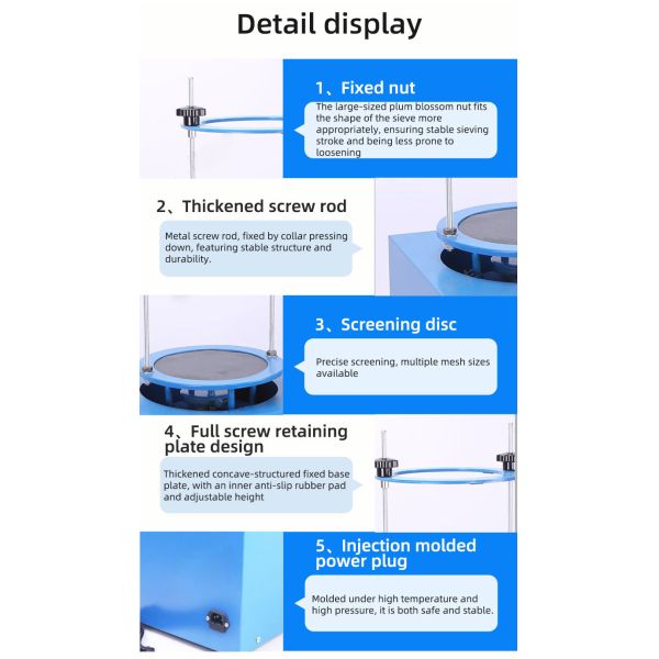 A screening machine is usually composed of a sieve frame (containing different-sized sieve screens), a driving system (providing vibration or shaking power), a control system (adjusting parameters such as frequency and time), and a base, etc. The material of the sieve screen can be selected from stainless steel, nylon, copper, etc., depending on the application scenario. The aperture size follows international or industry standards (such as ISO, ASTM, etc.), meeting the screening requirements for different particle size ranges.
