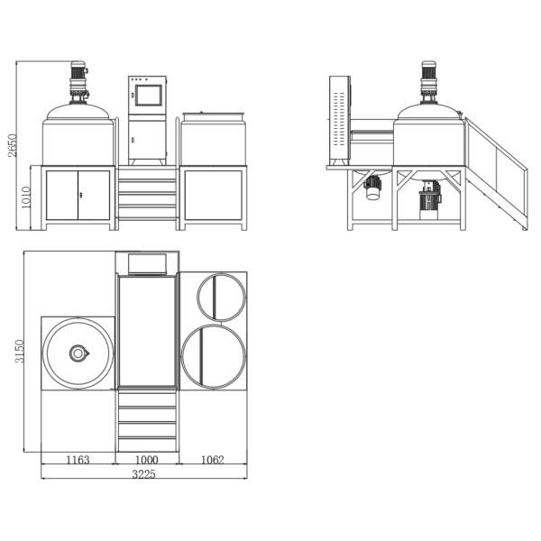 The fixed type vacuum emulsifier mainly consists of a water pot, oil pot, emulsification pot, vacuum system, electrical control system (PLC optional), and operating platform.
